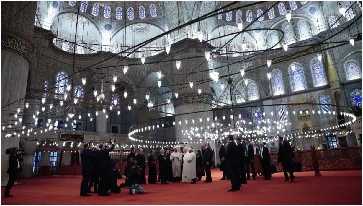 وصل البابا ليون الرابع عشر إلى إسطنبول في ثالث أيام رحلته، حيث تجوّل في المسجد الأزرق، أحد أبرز معالم المدينة العثمانية، مستمعًا إلى شرح تاريخي عن المكان دون أداء صلاة. ظهوره بحذاء منزوع وجوارب بيضاء كان إشارة احترام للمكان وروّاده، في استمرار لنهج الانفتاح على المسلمين السنّة في تركيا.