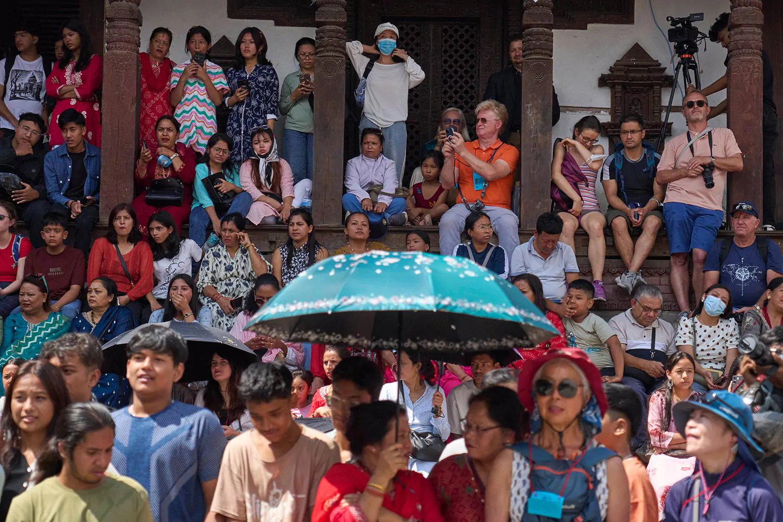 نيباليون وسياح يتابعون الموكب الذي تنقل فيه الإلهة الحيّة الجديدة في نيبال، كوماري أرياتارا شاكيا، إلى قصر المعبد "كوماري غار" حيث Il s'agit du 30 janvier 2025. (صورة لوكالة أسوشيتد برس/نيرنجان شريستا)