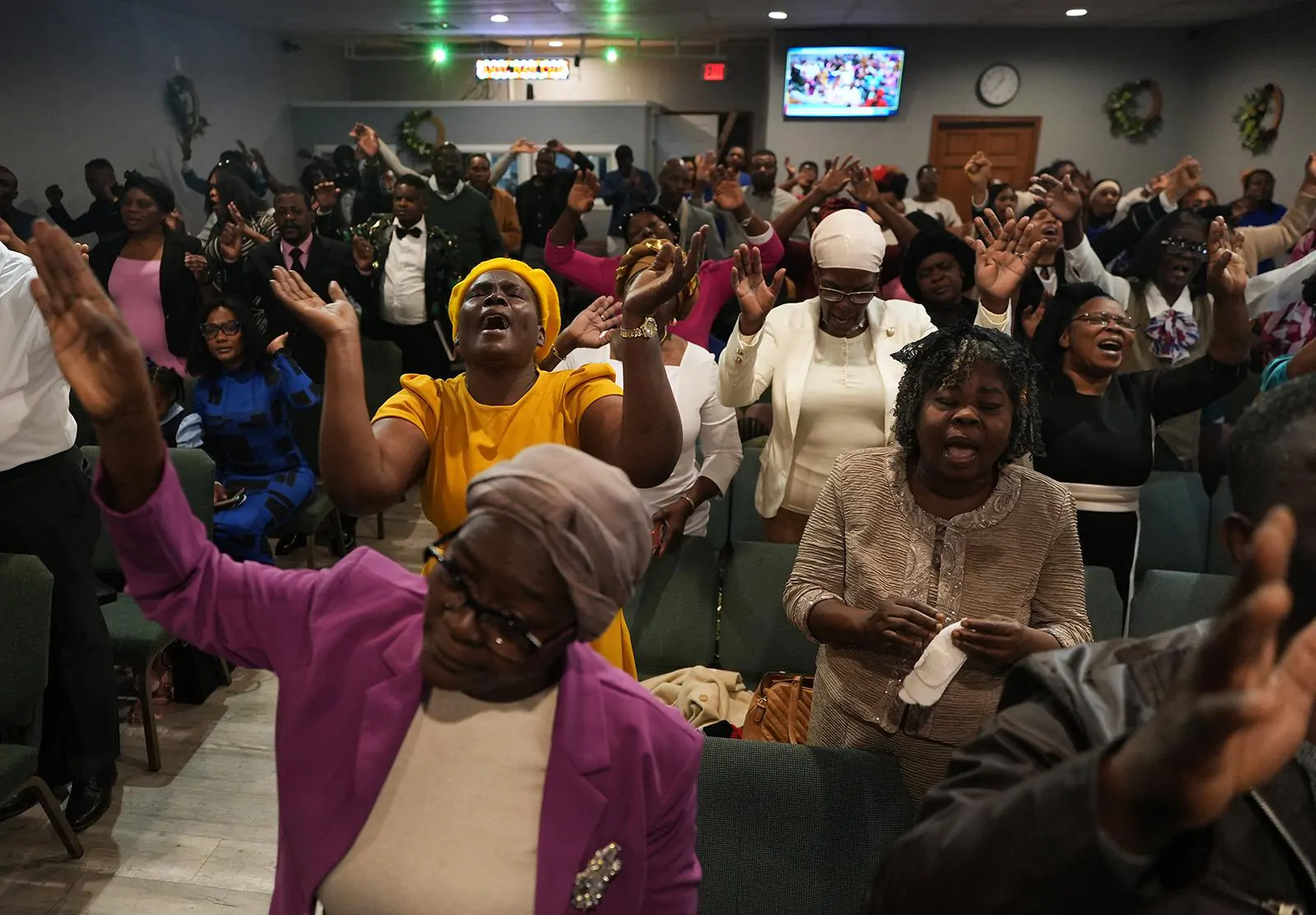 يحضر المصلون قداسًا دينيًا في الكنيسة الإنجيلية الهايتية الأولى في سبرينغفيلد، أوهايو، يوم الأحد 1 فبراير 2026. (صورة AP/لويس أندريس هيناو)