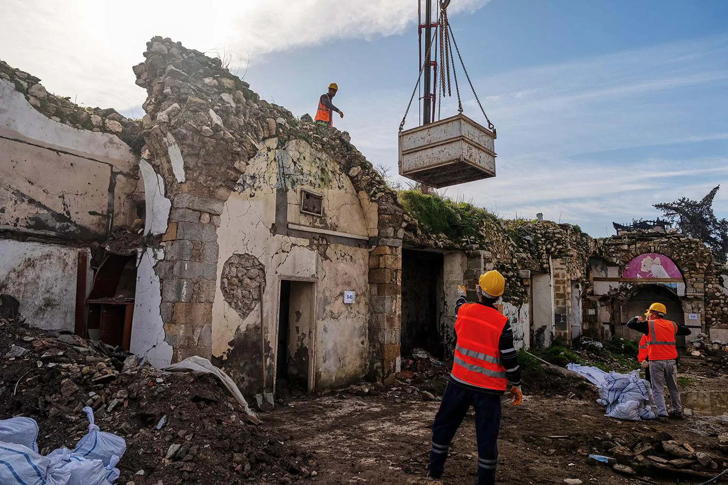 عمال يزيلون الأنقاض وينقذون الأحجار من أنقاض كنيسة القديس بولس الأرثوذكسية اليونانية، التي تضررت في زلزال عام 2023، في مدينة أنطاكيا جنوب تركيا، يوم الأربعاء 4 فبراير 2026. (صورة من وكالة أسوشييتد برس/مراد كوجاباس)