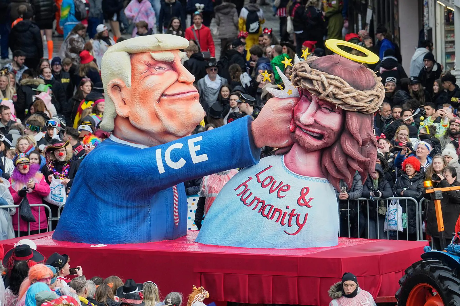 تظهر عربة كرنفالية تُجسد الرئيس الأمريكي دونالد ترامب خلال موكب كرنفال روزمونداي في دوسلدورف، ألمانيا، يوم الاثنين 16 فبراير 2026 (صورة من وكالة أسوشيتد برس/مارتن مايسنر).