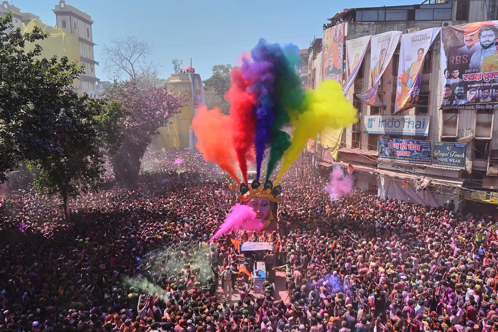 يُغنّي المحتفلون ويرقصون بالماء والبودرة الملونة خلال موكب مهرجان رانجبانشامي، الذي يُقام بعد خمسة أيام من هولي. يرمز المهرجان إلى انتصار الحب الإلهي وتطهير الطاقات السلبية، في إندور، بولاية ماديا براديش بوسط الهند، الأحد 8 مارس/آذار 2026. (صورة من وكالة أسوشيتد برس/أ. معيد فاروقي)