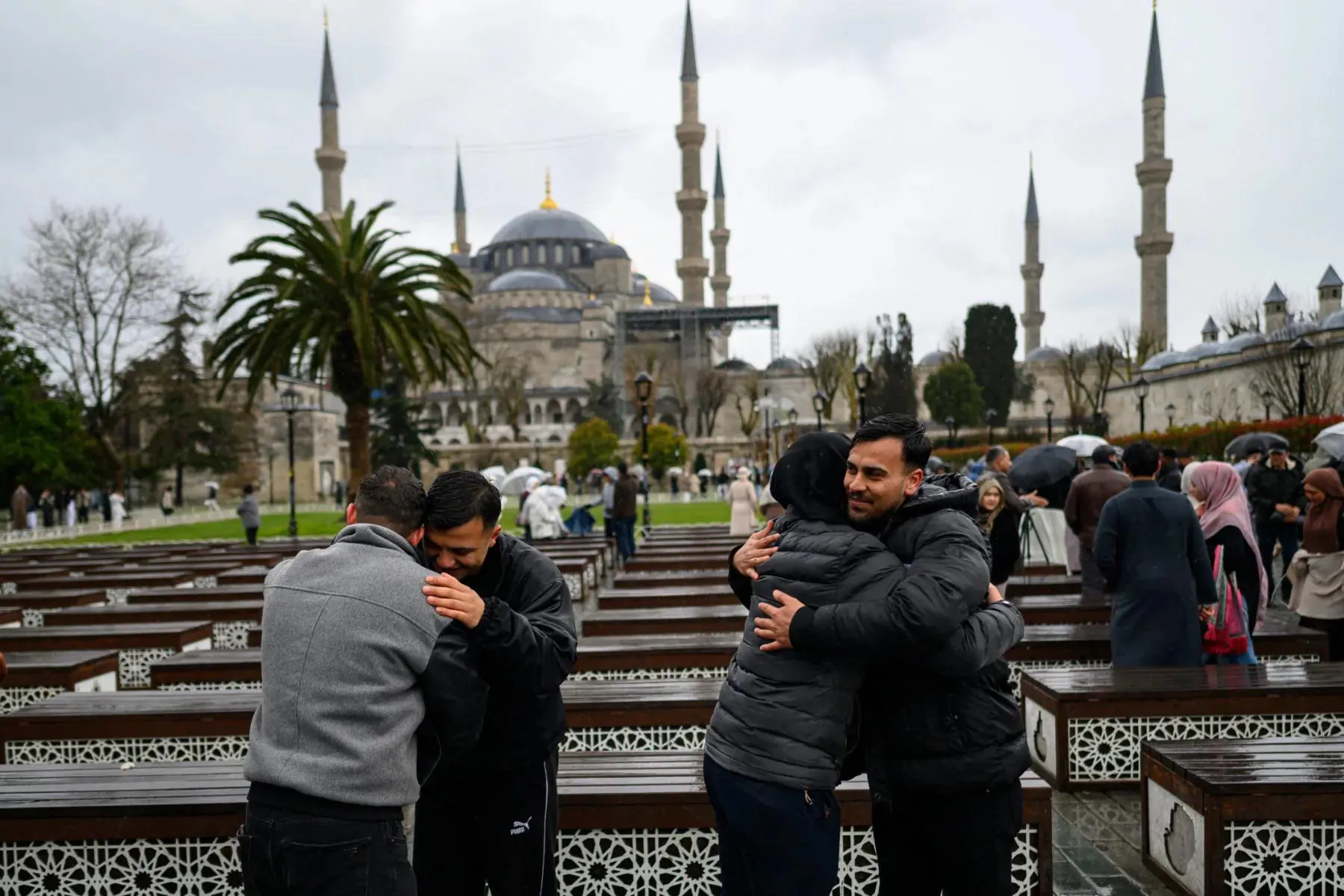 مسلمون يتبادلون التهاني خارج مسجد السلطان أحمد (المسجد الأزرق) بينما يؤدون صلاة عيد الفطر صباحًا في إسطنبول بتركيا، 20 مارس/آذار 2026.