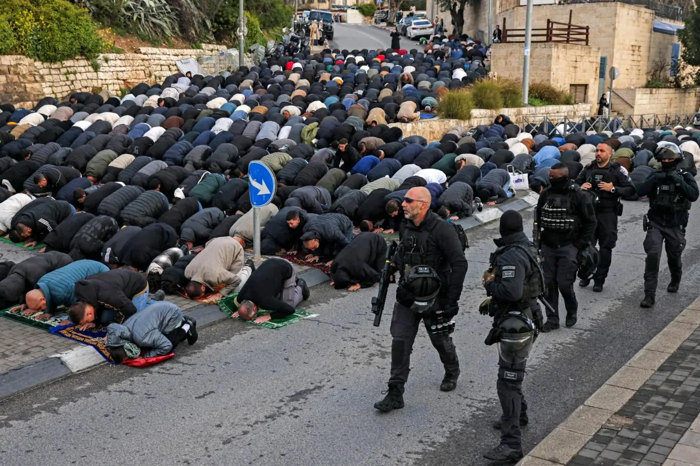 تسير قوات الأمن الإسرائيلية بمحاذاة حشود المصلين المسلمين المتجمعين خارج أسوار البلدة القديمة في القدس لأداء صلاة عيد الفطر صباح 20 مارس/آذار 2026.